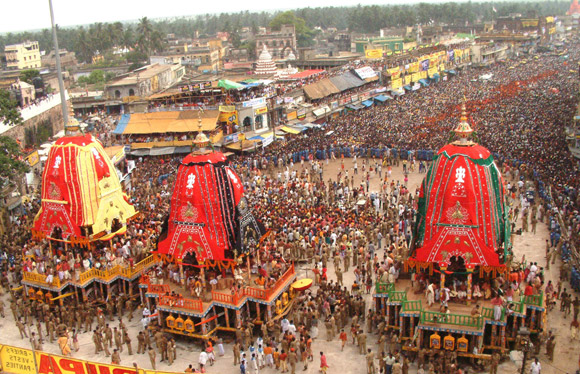 The most famous festival of Jagannatha is the Ratha Yatra (Literally Pilgramage of Carts).
